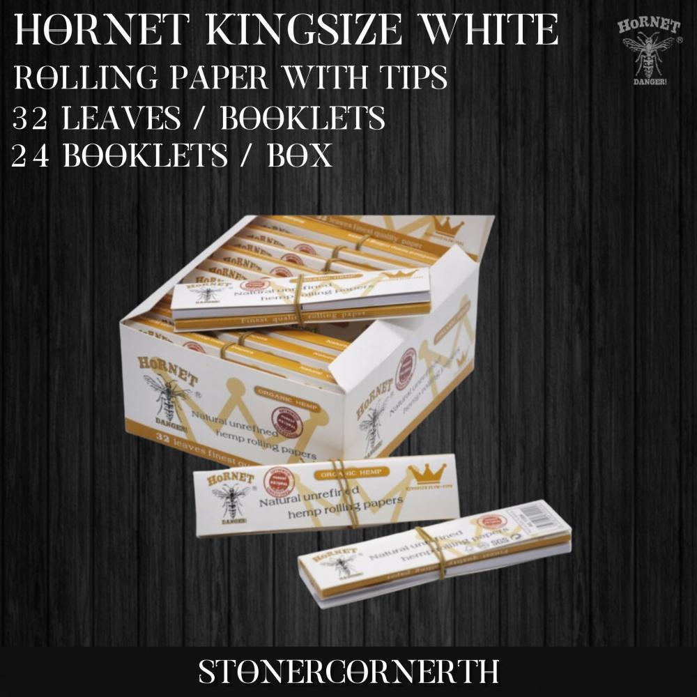 Hornet Kingsize White Rolling Paper with Tips – Premium white rolling papers from the trusted Hornet brand. Each booklet includes filter tips for added convenience. Ideal for those who prefer thin, lightweight papers that burn slowly and preserve the natural flavor of herbs.
