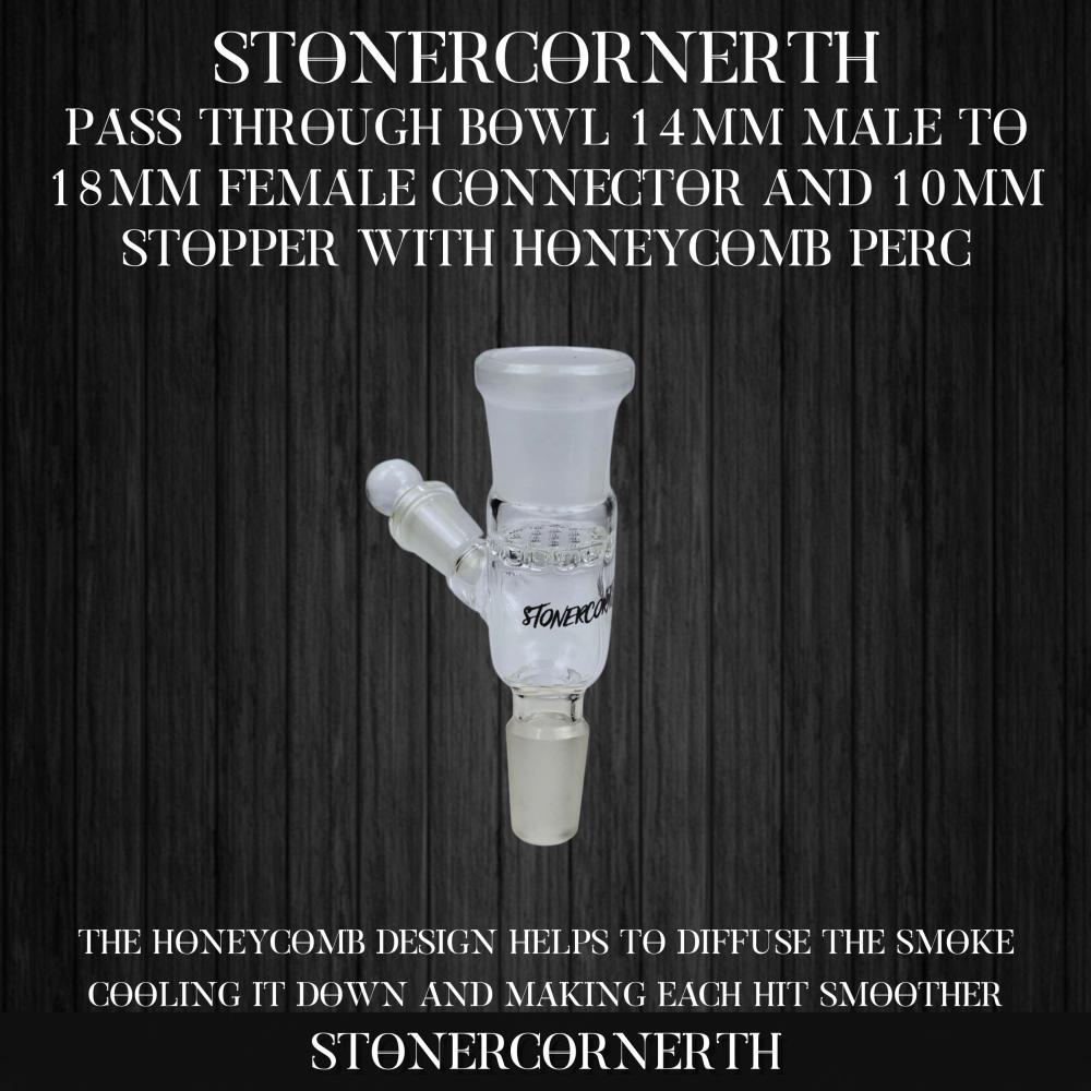 Stonercornerth Pass through bowl 14mm male to 18mm female connector and 10mm stopper with honeycomb perc