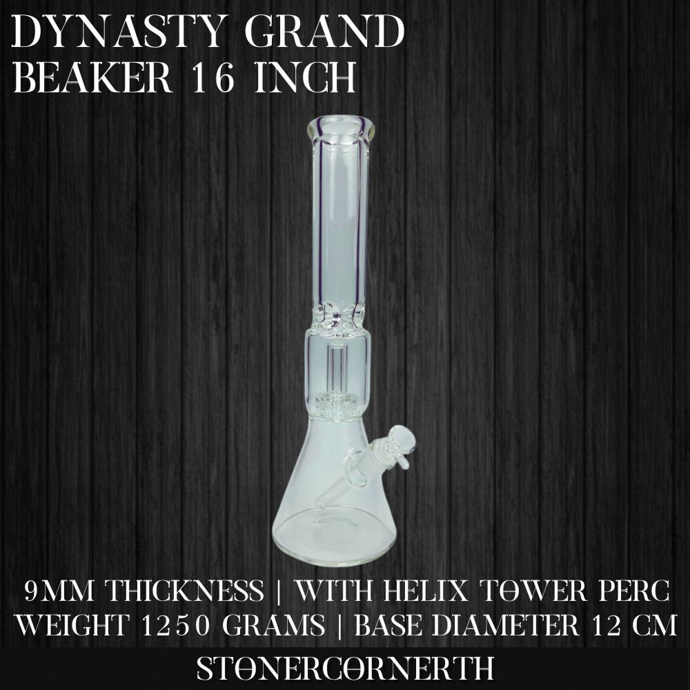 The Dynasty Grand Beaker stands 16 inches tall (approximately 40 cm) and is crafted from premium borosilicate glass with a 9 mm thickness, ensuring exceptional strength, heat resistance, and durability. It features a distinctive Helix Tower Perc design that filters and diffuses smoke efficiently, resulting in a smoother, cooler hit with enhanced flavor clarity.