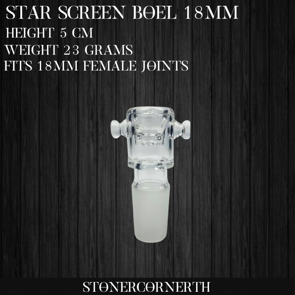 This premium 18 mm male glass bowl features an integrated star-shaped screen to prevent debris from falling into your bong or filtration system. It ensures a cleaner smoking experience while promoting even combustion for improved flavor and performance.