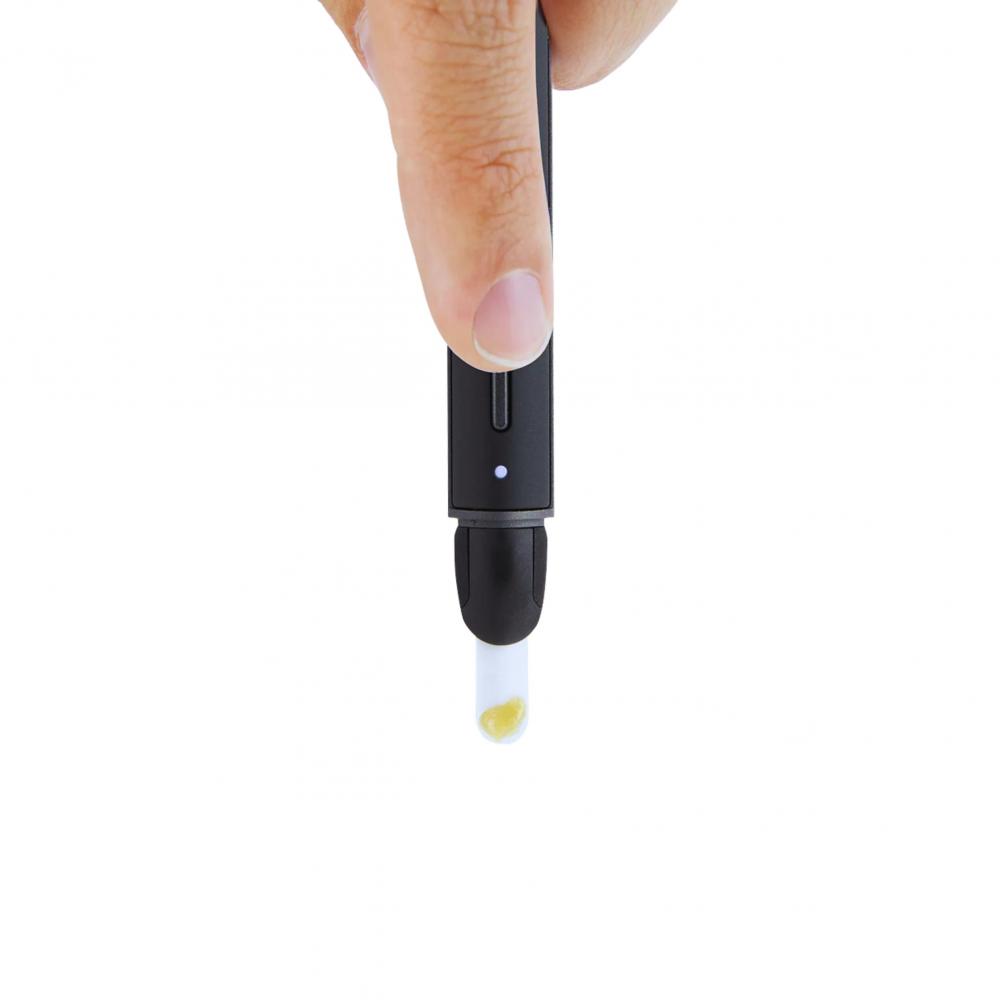 The device features a new glossy ceramic tip, allowing for easier scooping and releasing of extracts while reducing residue buildup and accommodating larger amounts. It also comes with a redesigned cap that fits securely, enhances portability, and provides better protection for the device.