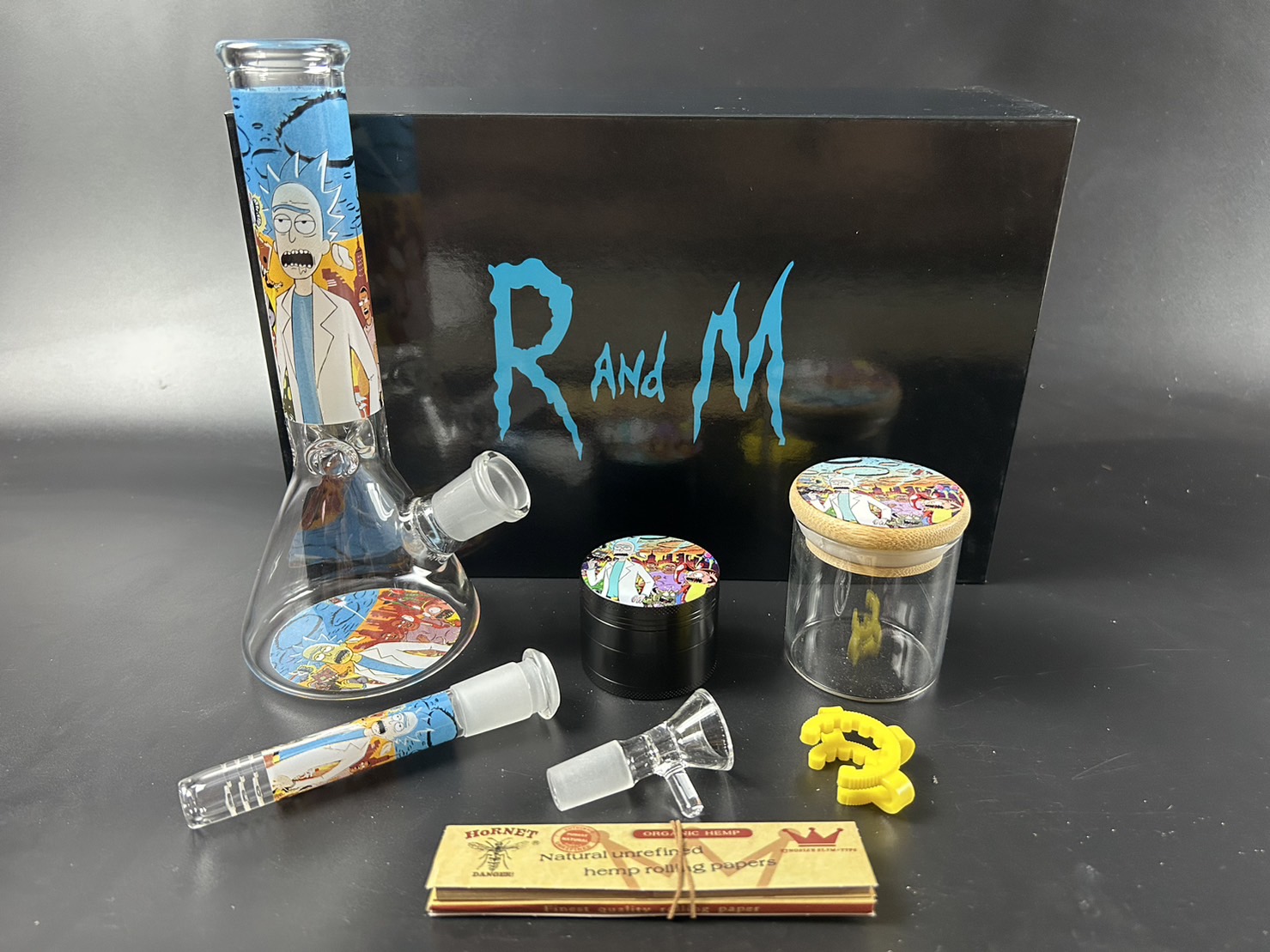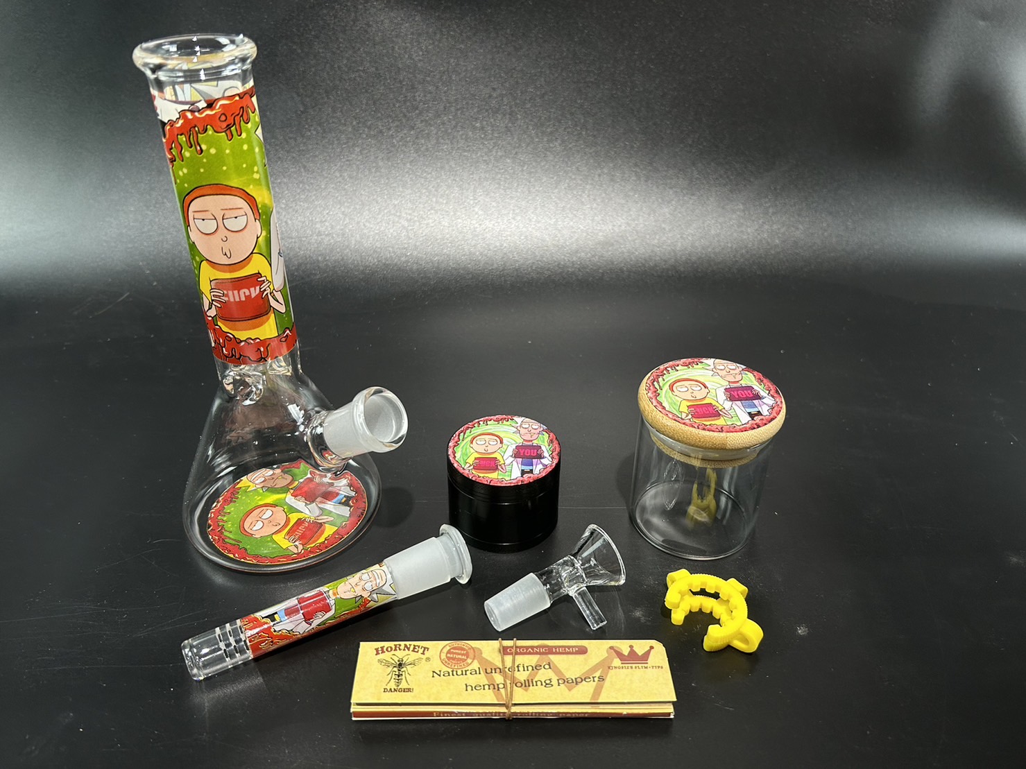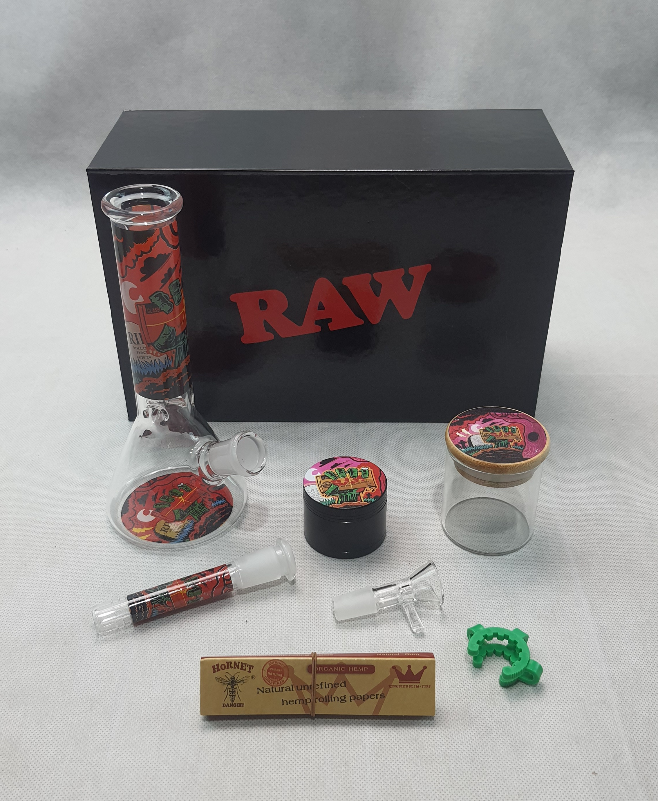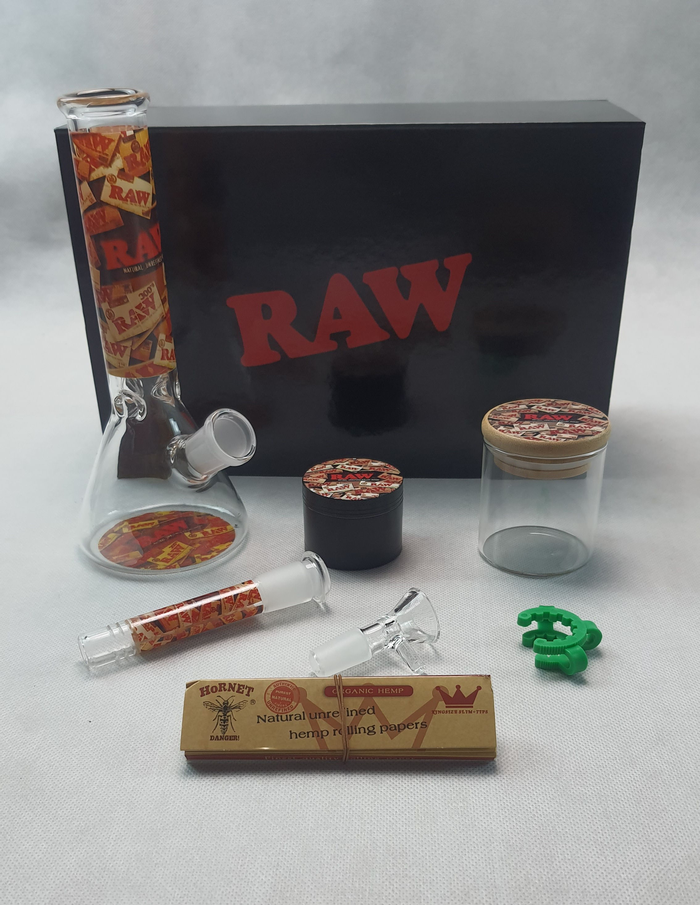ชุดเซตบ้องแก้วทรงบีกเกอร์ มาพร้อมกับ ที่บดสมุนไพร โหลแก้วบรรจุสมุนไพร กิ๊บล็อค กระดาษโรลแบบคิงไซส์ และกล่องจัดเก็บสวยงาม