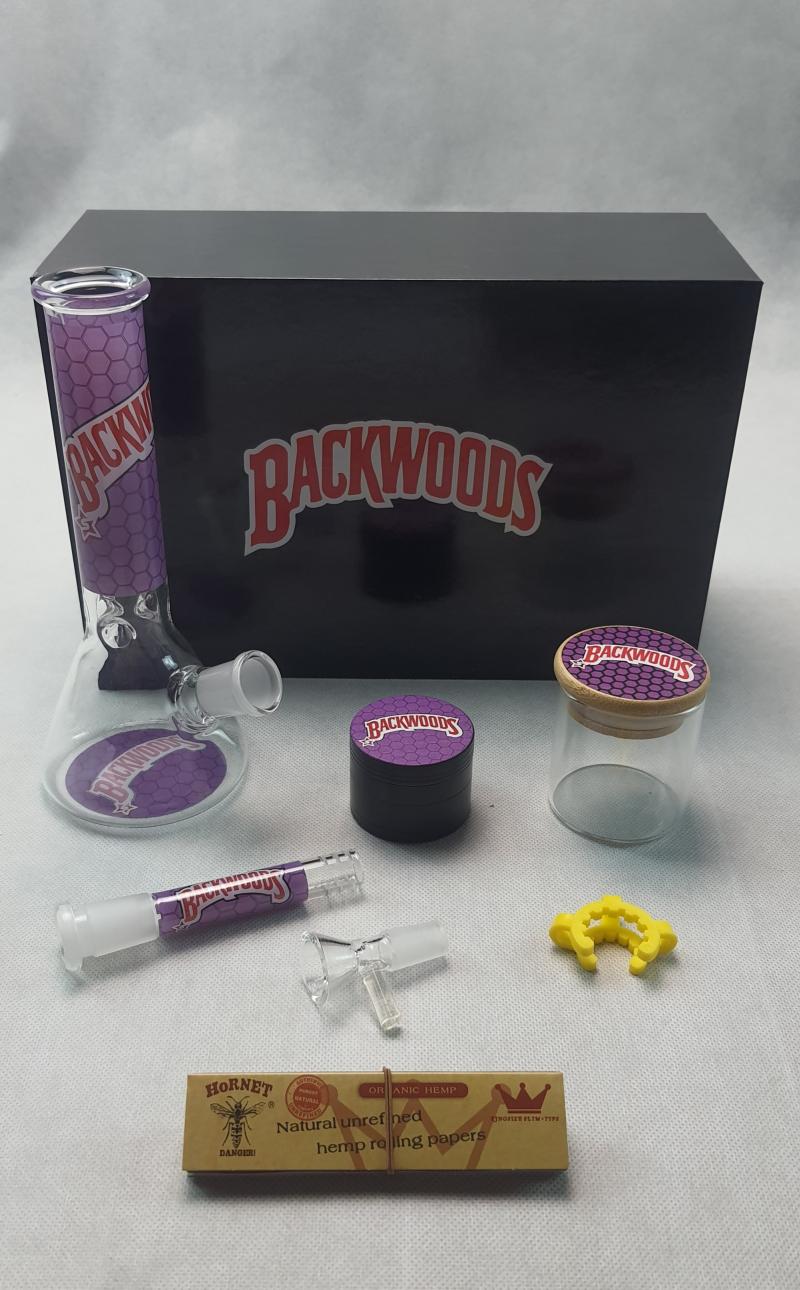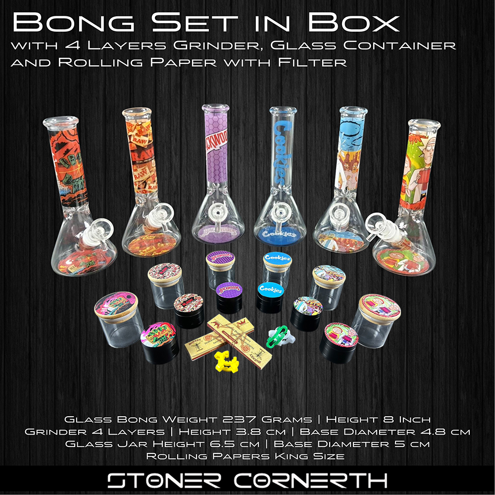 Bong Set in Box 8 Inch with 50 mm 4 Layers Grinder, 65x50 mm Glass Container, and Rolling Paper with Filter