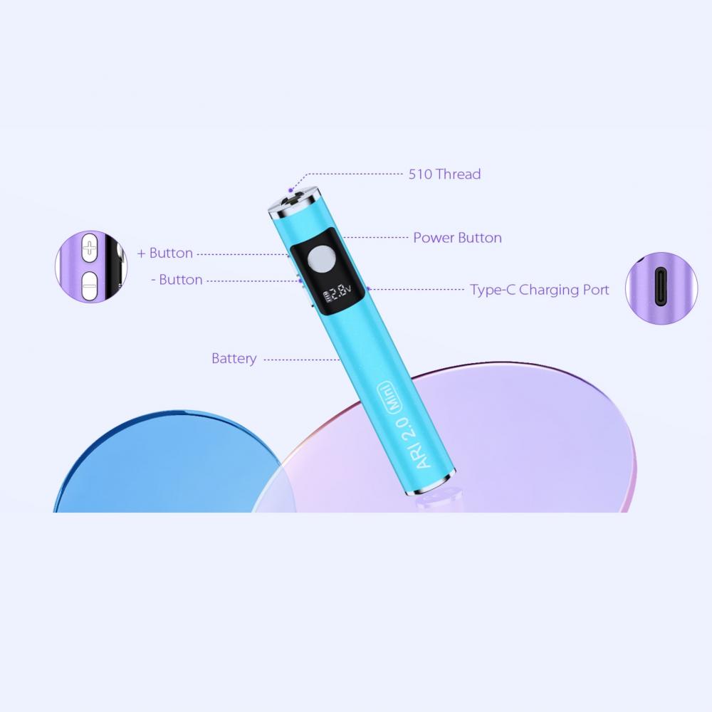 The Yocan Ari 2.0 Mini is the smallest 510-thread battery in the Ari 2.0 series, designed to be both smart and ultra-portable in one compact device. It is ideal for cartridge users who want a lightweight, easy-to-use device with stable performance.
