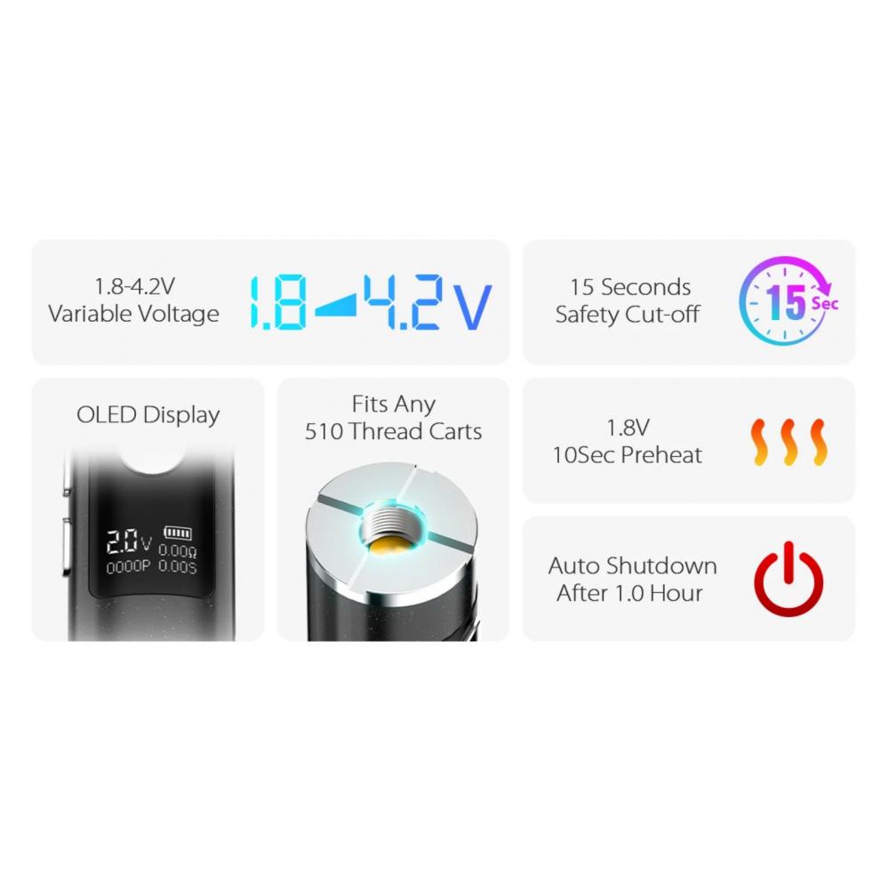 It supports an adjustable voltage range of 1.8V – 4.2V, giving you the flexibility to customize your experience—whether you prefer smoother vapor or stronger hits.