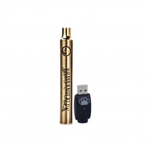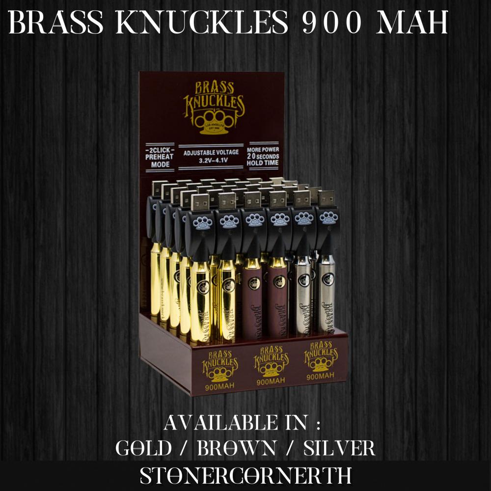 แบตเตอรี่ Brass Knuckles 900 mAh ใช้การเชื่อมต่อ 510 ซึ่งทำให้เข้ากันได้กับตลับหมึก 510 ทั้งหมด หากต้องการชาร์จอุปกรณ์ ให้ขันสกรูเข้ากับที่ชาร์จ USB เมื่อคุณต่อคาร์ทริดจ์และเลือกการตั้งค่าพลังงาน ให้กดปุ่มเปิด/ปิดค้างไว้ในขณะที่คุณหายใจเข้าเพื่อเริ่มต้นการเดินทาง