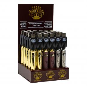 แบตเตอรี่ Brass Knuckles มีความจุ 900mAh พร้อมแรงดันไฟฟ้าผันแปรและโหมดอุ่นเครื่อง ทำงานเหมือนแบตเตอรี่ปากกา vape ทั่วไปด้วยการตั้งค่าการทำงานปุ่มเดียว: 5 คลิกจะเปิดหรือปิดแบตเตอรี่ 2 คลิกจะเปิดใช้งานโหมดอุ่นเครื่องเป็นเวลา 10 วินาที และ 3 คลิกจะเปลี่ยนแรงดันไฟฟ้า ไฟ LED จะเปลี่ยน สีตามการตั้งค่าแรงดันไฟฟ้า: สีเขียว - 2.4V | สีน้ำเงิน - 3.2V | สีแดง - 4.0V